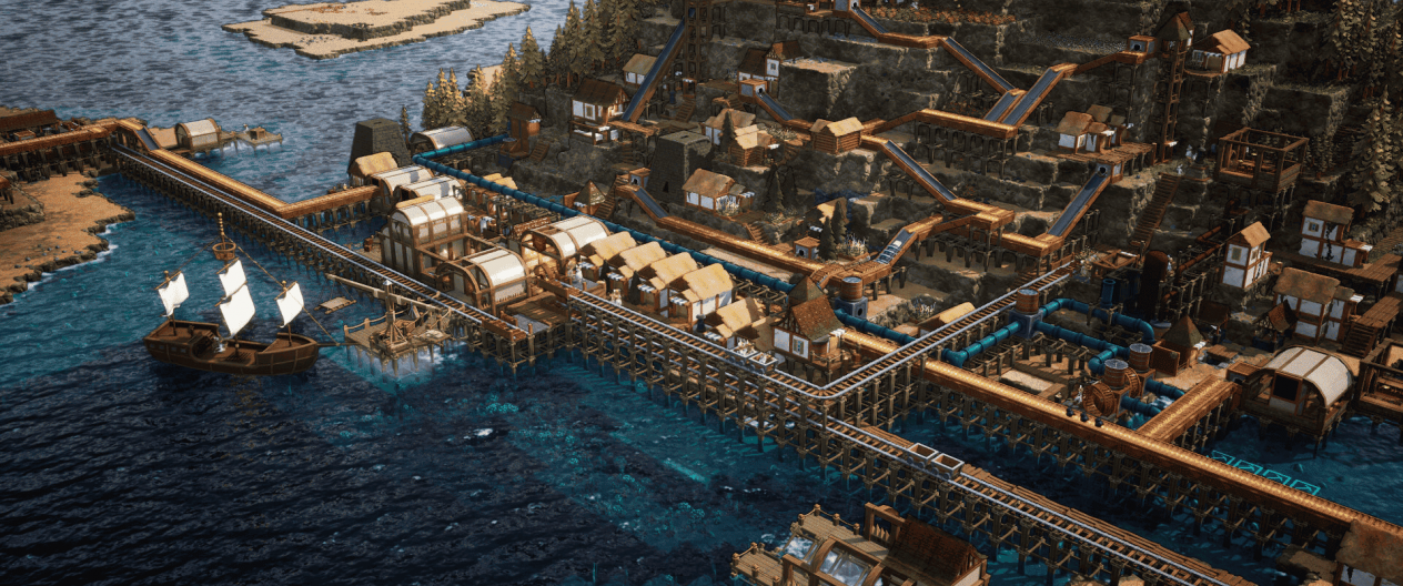 Чтобы не завалиться микроменеджментом, игра предлагает мощные инструменты автоматизации. Можно выстраивать сети конвейеров, слайдов, рамп и лифтов, которые гоняют ресурсы по острову без участия рабочих. Отдельный уровень планирования приносит система труб, по которым по острову гоняются вода и пар. Они нужны и для базовых нужд вроде снабжения колодцев, и для более продвинутых устройств, которые открываются в исследованиях.